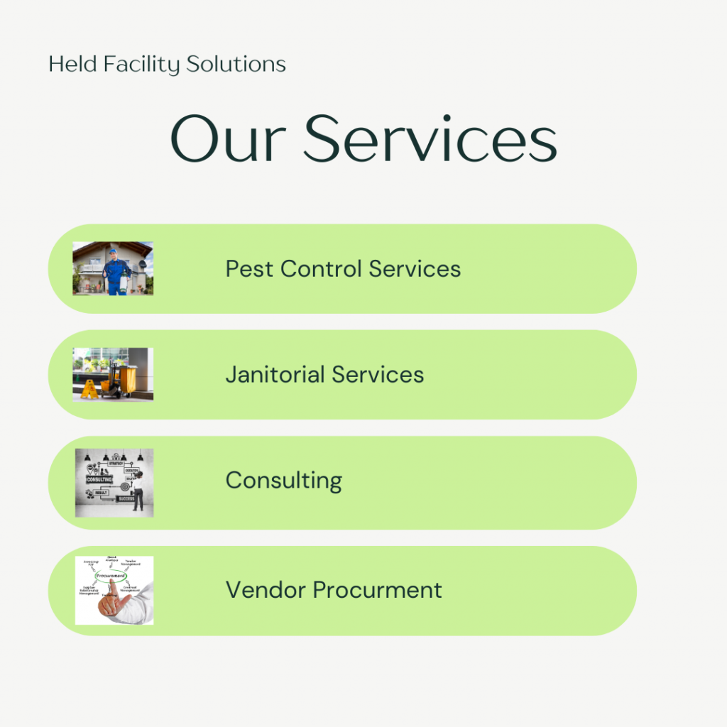 Held Facility Solutions is your go-to for exceptional commercial maintenance. From pest control to janitorial services, we’re dedicated to maintaining and elevating the standards of your business environments. In addition to our standard facility services we offer both consulting and vendor procurement services.